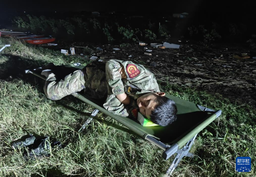 7月7日凌晨,在湖南省岳阳市华容县团洲垸洞庭湖一线堤防决口处,随时待命的民兵突击队员合衣小憩。新华社记者 黎云 摄
