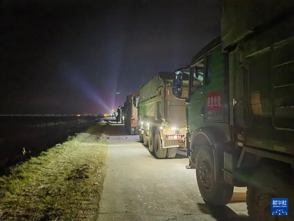 时间指向凌晨4点,通向决口的公路上,满载石料的卡车、工程车辆仍然排着“长龙”,蜿蜒3公里长,机械的轰鸣声响彻大堤。