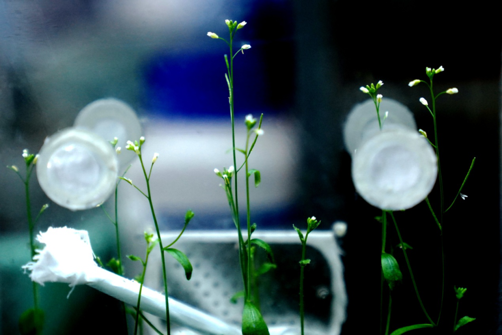 8月29日,在中国科学院分子植物科学卓越创新中心拍摄的“太空同款”拟南芥培养单元里,拟南芥开的花。新华社记者 张建松 摄