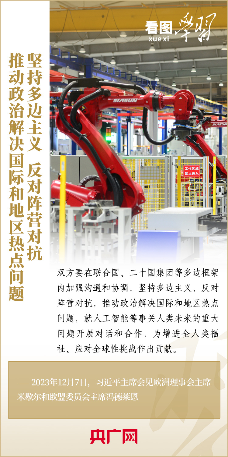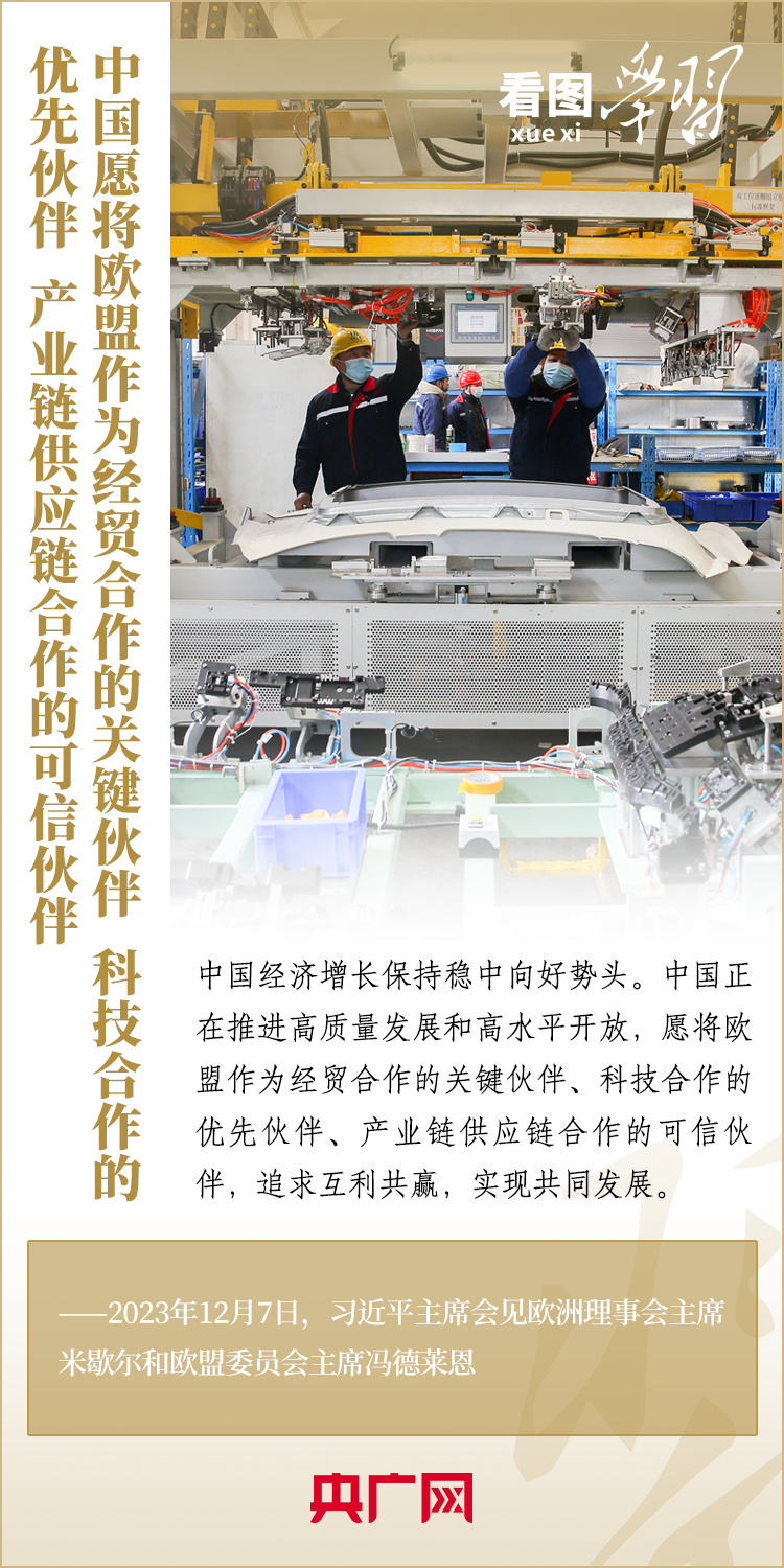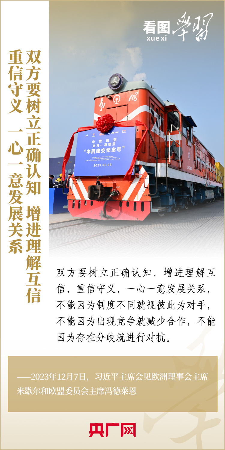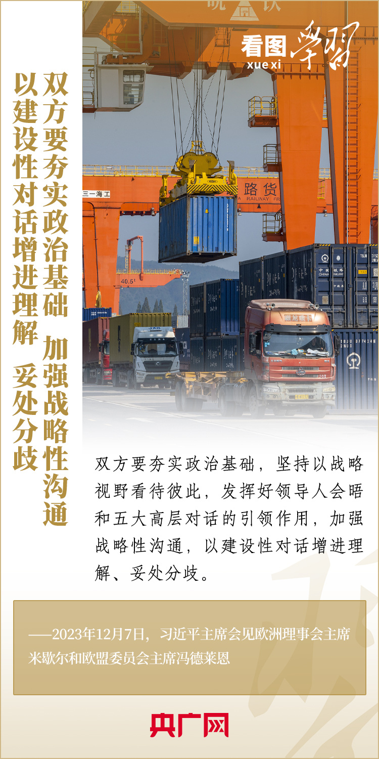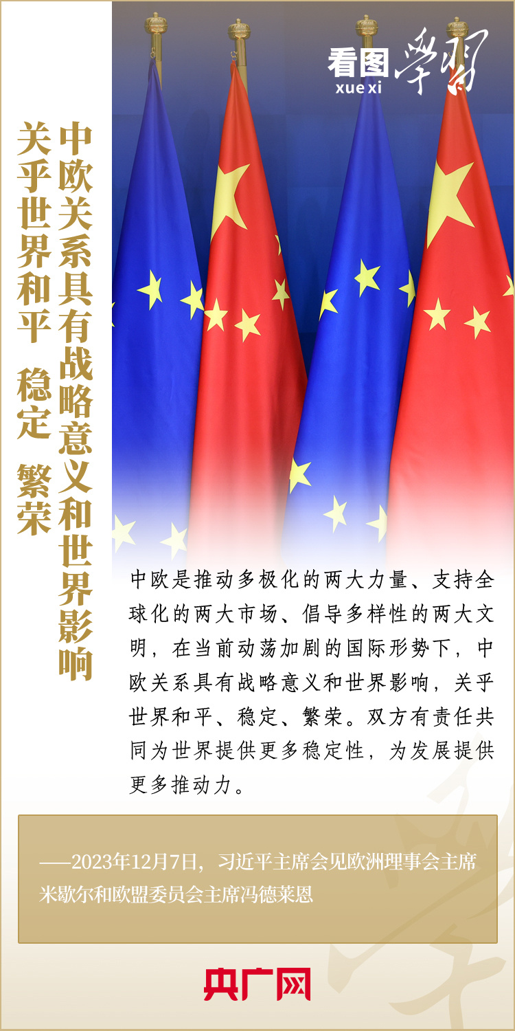 12月7日,国家主席习近平会见来华举行第二十四次中国—欧盟领导人会晤的欧洲理事会主席米歇尔和欧盟委员会主席冯德莱恩,双方就事关中欧关系的战略性问题,以及中欧各领域对话合作、双方重点关切、全球治理、国际和地区热点问题等深入坦诚交换看法,并就一系列问题达成重要共识。今年是中欧建立全面战略伙伴关系20周年,习主席强调,中欧关系具有战略意义和世界影响,关乎世界和平、稳定、繁荣。一起来学习!