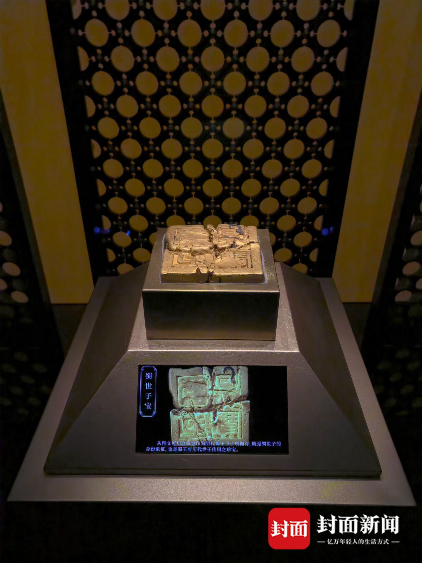 众多精美的文物中,不能不提“蜀世子宝”金印。据赵丽贤介绍,这枚“蜀世子宝”金印出水时碎成五块,散落范围超过30米,考古队员们用了半个月才找齐全部残块,其拼合过程本身就是一个考古传奇,“这枚金印总重达16斤,含金量高达95%。”