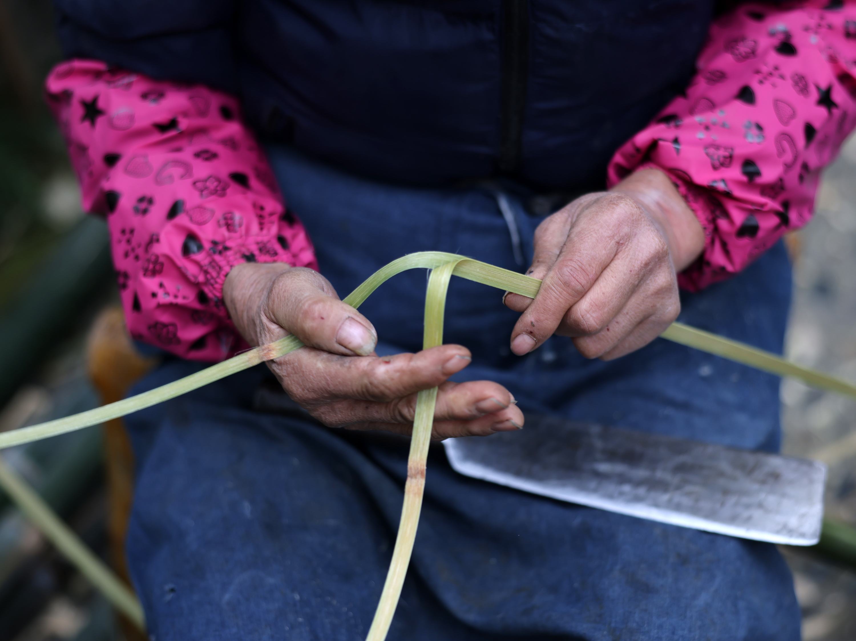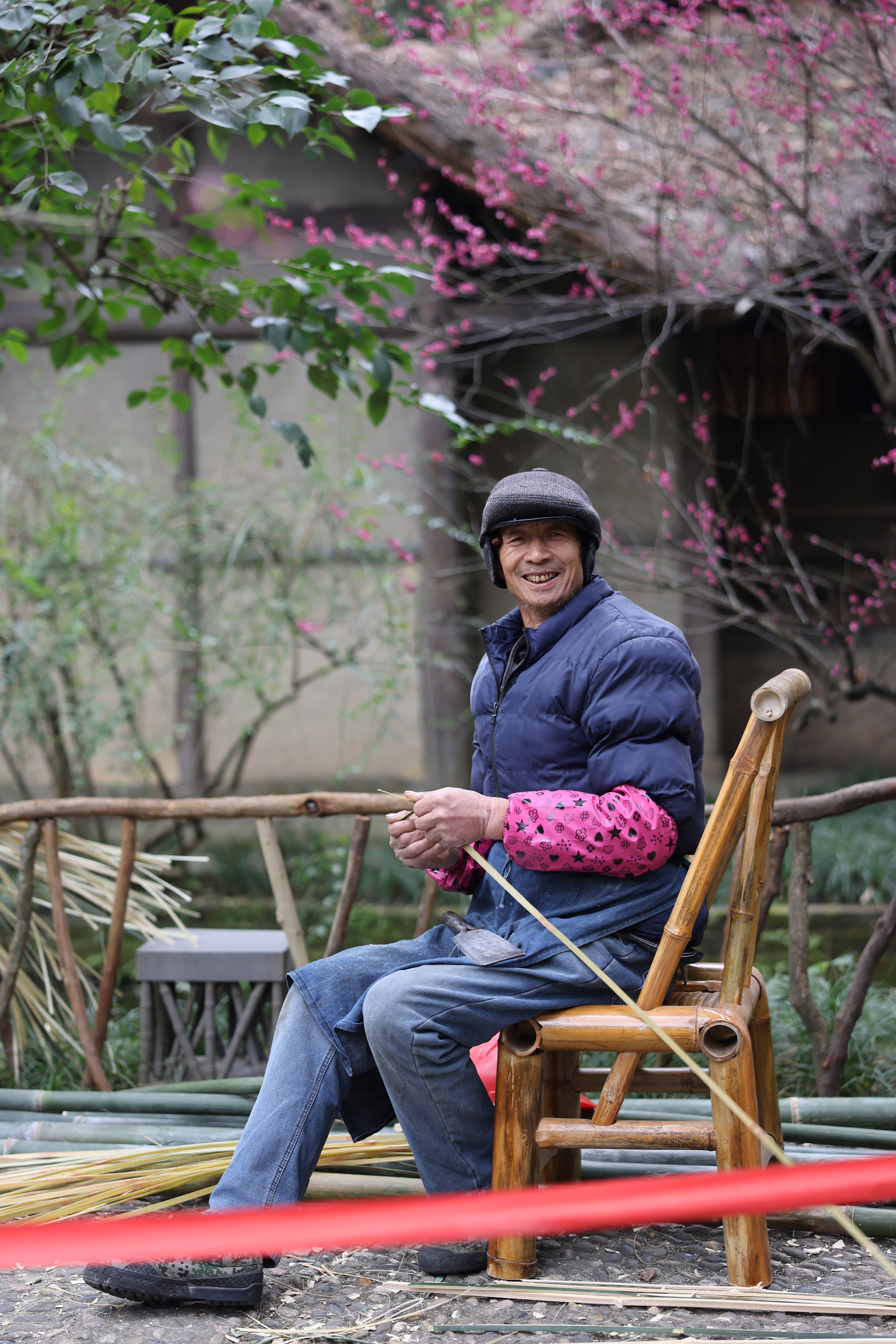 1月22日,成都杜甫草堂博物馆草堂茅屋旁,小毡帽、花袖套、薄棉衣,一张蓝色的围腰布遮住刘茂华大半个身体。来自成都市郫都区的刘茂华举起蔑刀,手起刀落之间,青竹一剖为二,二剖为四,所到之处竹片顺势而开,像削果皮一样,将竹片一层一层抽丝剥茧,剖成篾条和蔑丝。