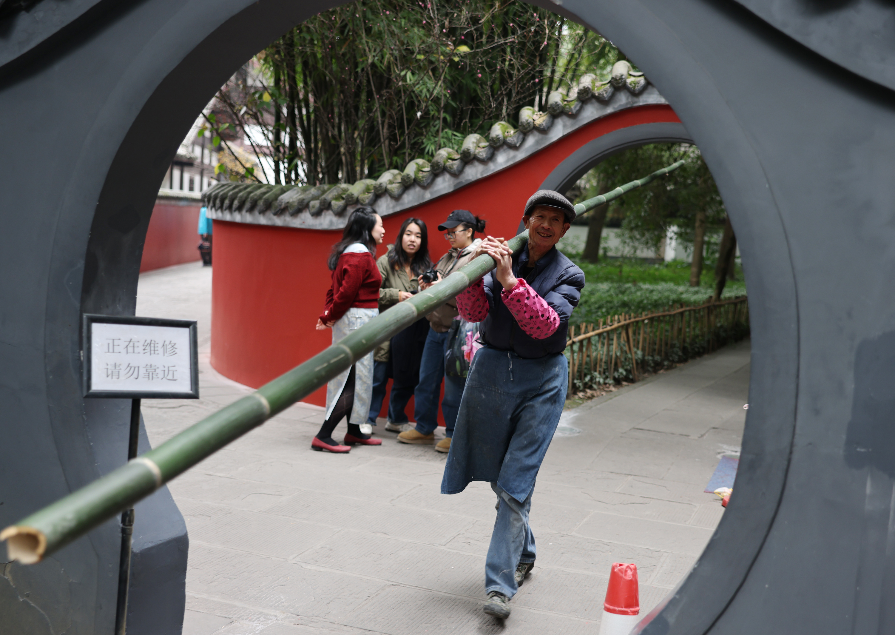 1月22日,成都杜甫草堂博物馆,72岁的刘茂华正在搬运竹子。维修中用到的竹子都生长在杜甫草堂博物馆。