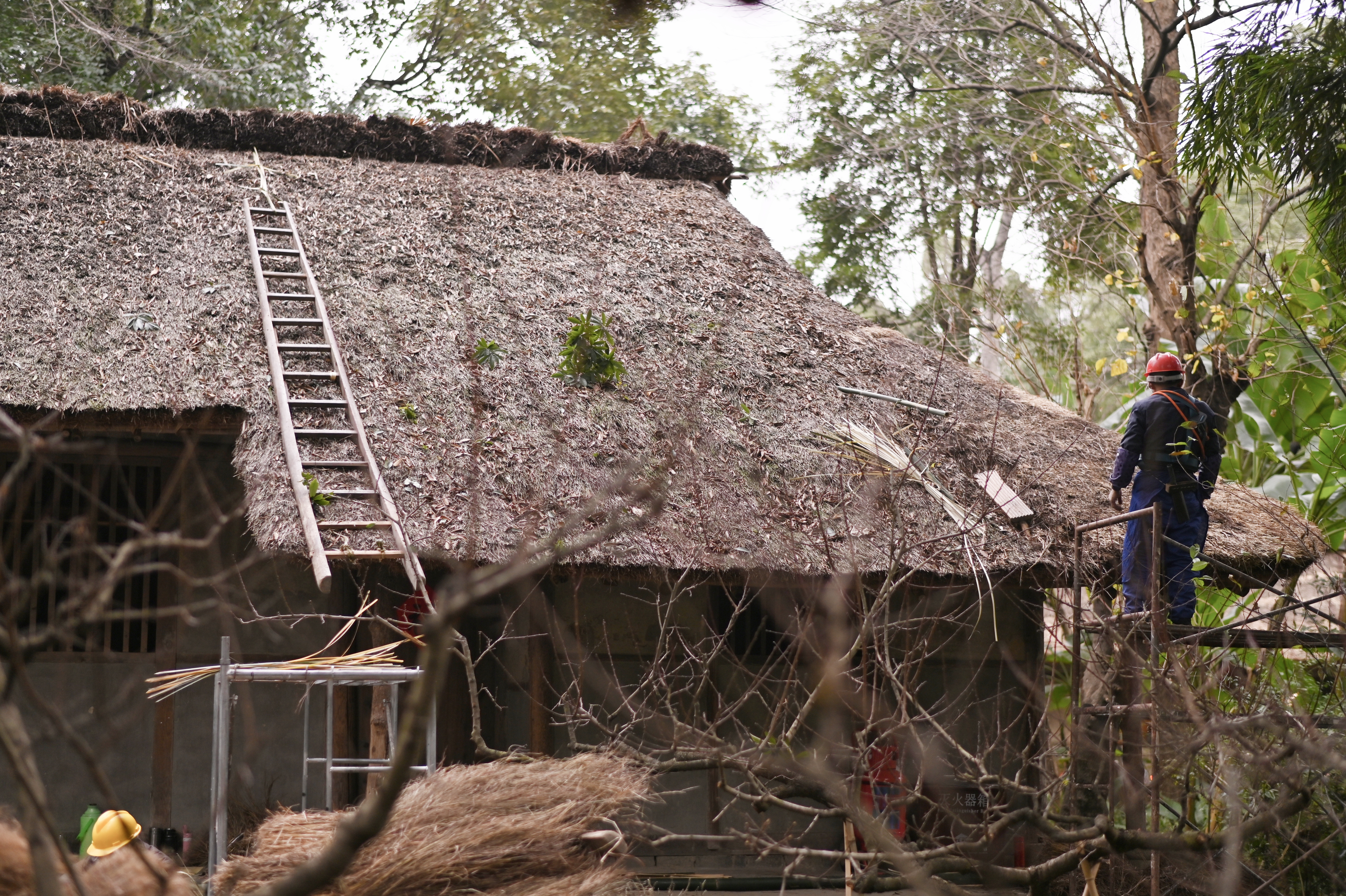 1月20日,成都杜甫草堂博物馆,维修师傅在房顶工作,弯刀和篾条就是他们的工具。