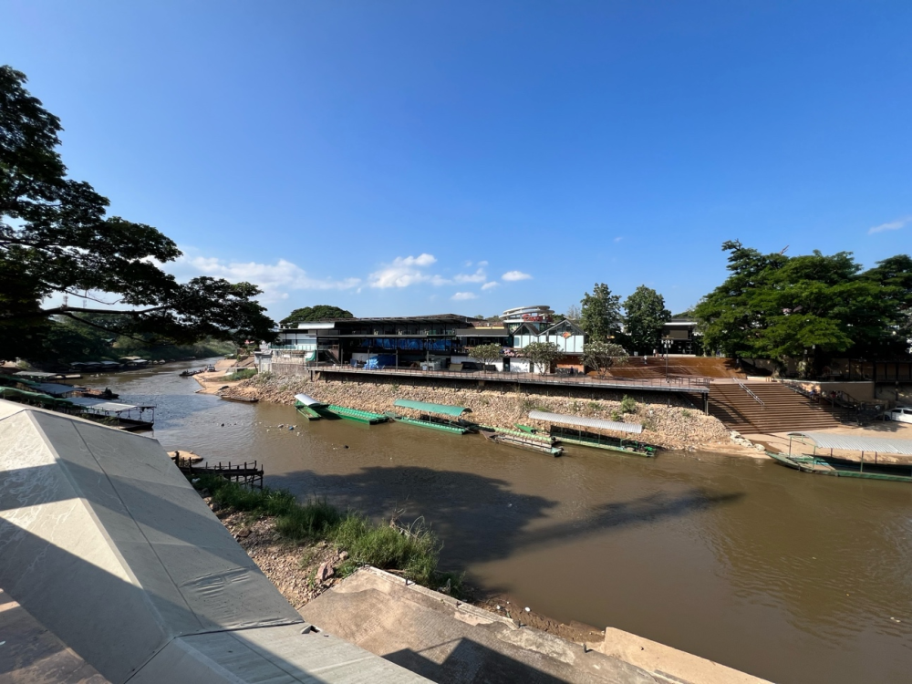 2023年11月28日,从泰国境内拍摄的缅甸一侧娱乐设施以及河上的渡口。(新华社记者林昊摄)