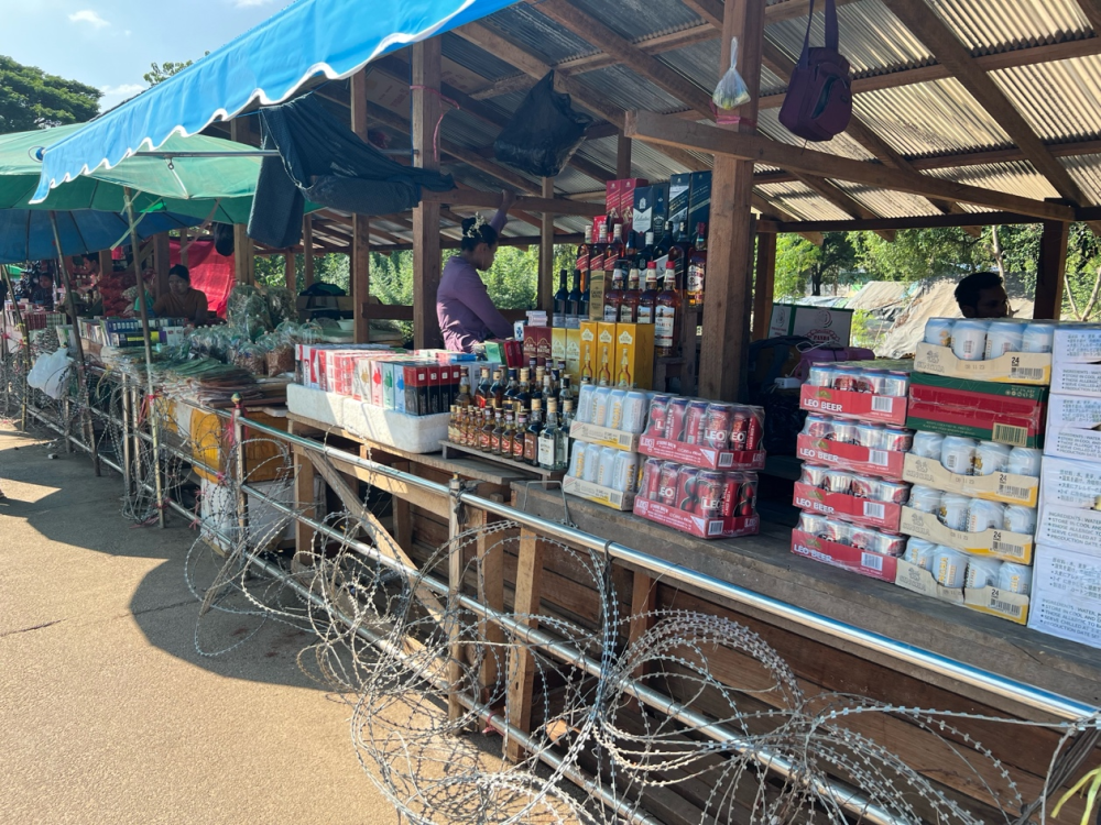 2023年11月27日,在泰国湄索,缅甸商户隔着铁丝网售卖商品。(新华社记者林昊摄)