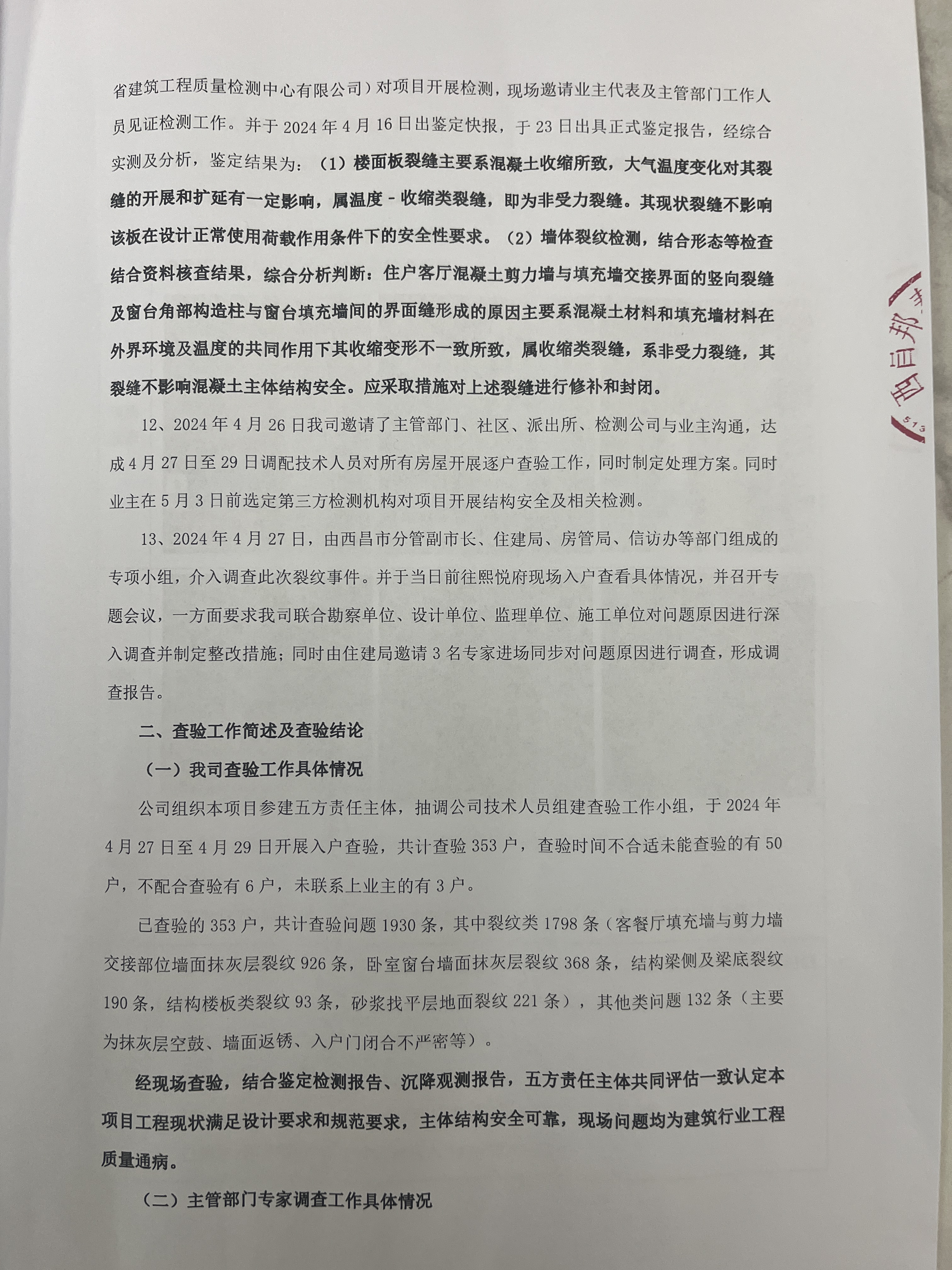《公告》还提到,4月29日西昌市住建局邀请的3名专家进场后出具的调查报告结论为:与检测中心出具的鉴定报告结论一致,结果为主体结构安全可靠,现场问题均为建筑行业工程质量通病。