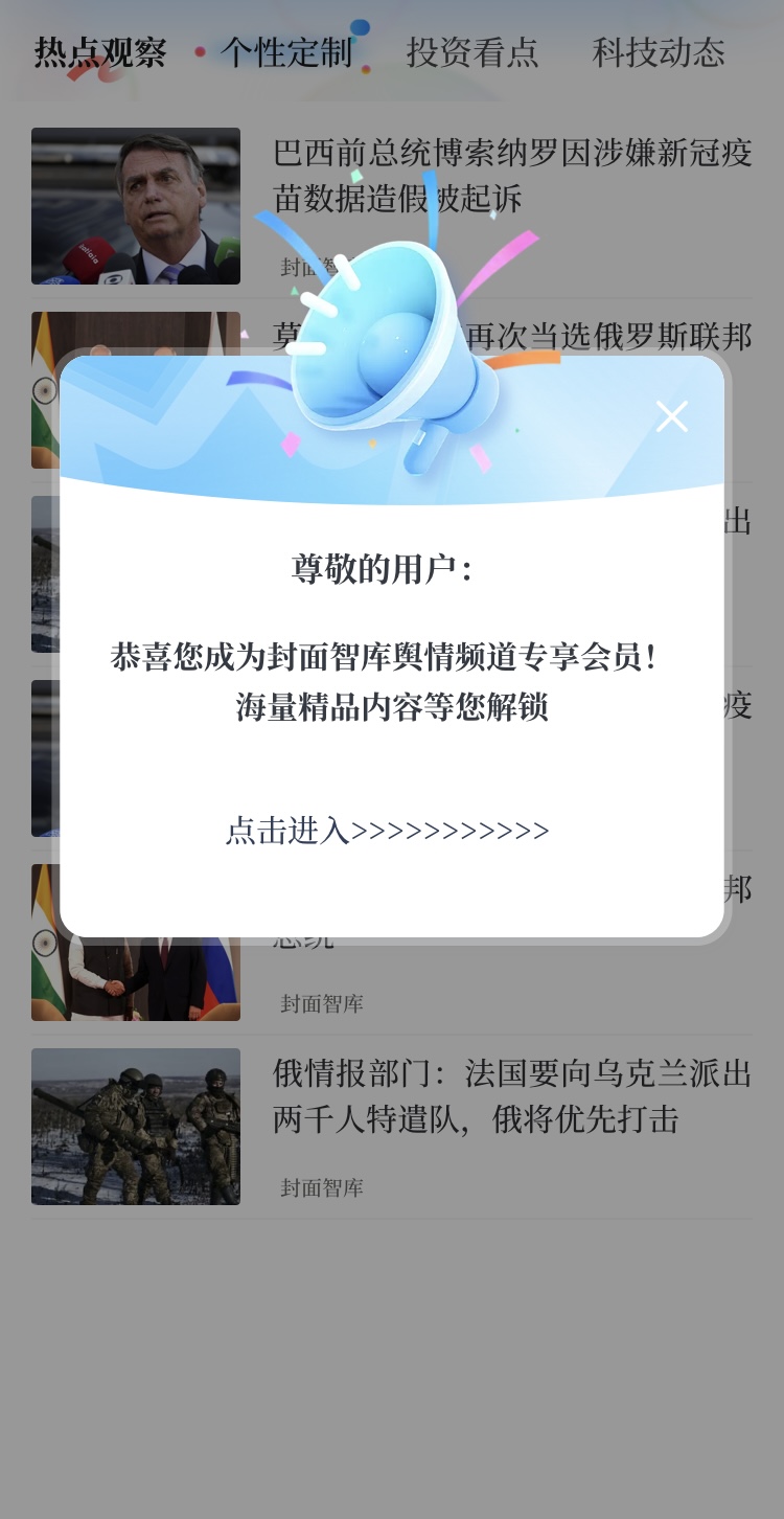选择订阅服务,您可以手握“一人一策”。网络热点来势汹汹,万能模板难以抵挡。封面智库坚持私密性、专业性、及时性、独家性、可读性、价值度、可持续性等核心标准相统一,实时更新关键信息,形成“个性定制—热点观察—投资看点—科技动态”智库全链条,通过个性定制服务让热点分析既好看又管用。