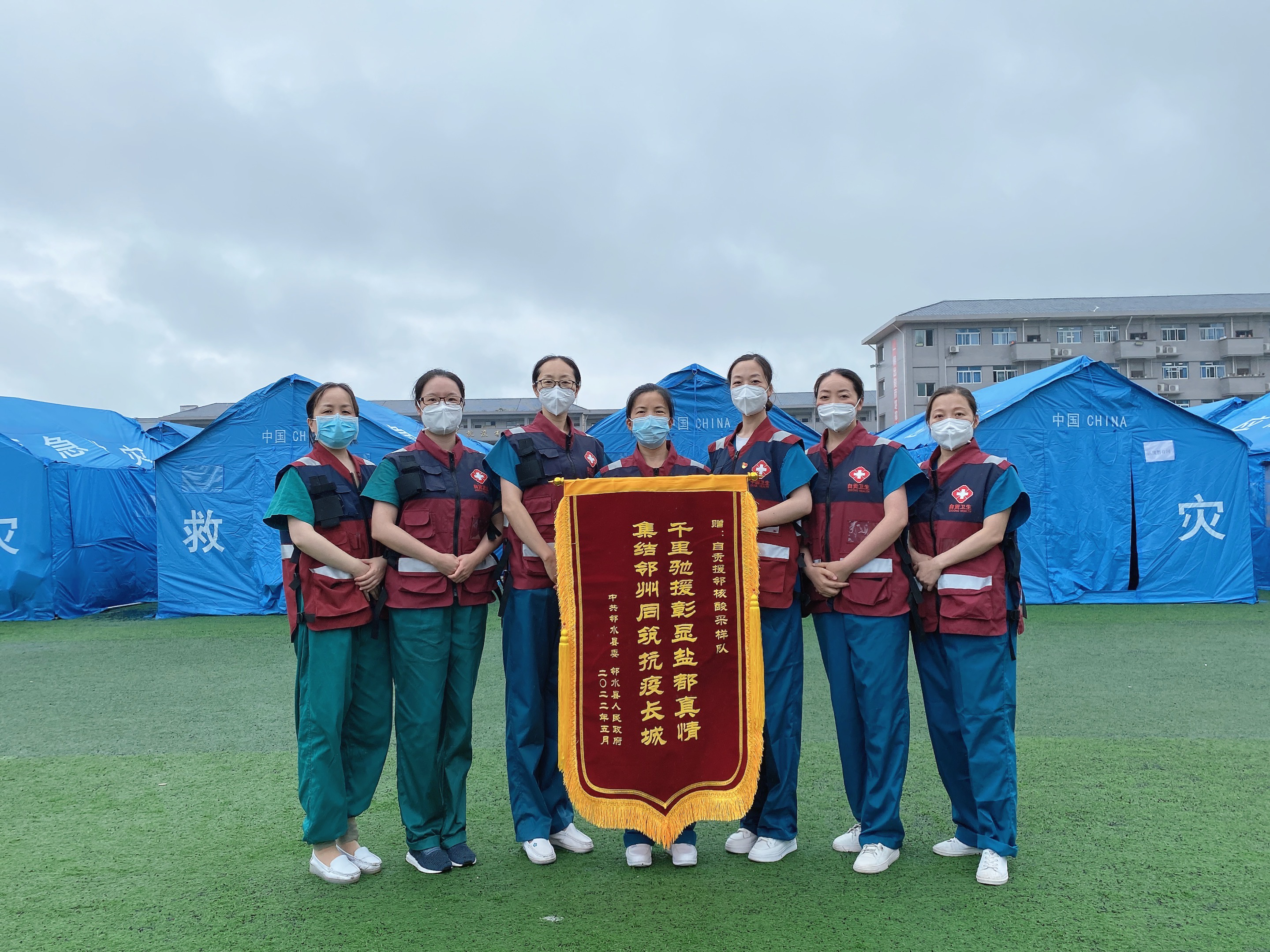 在这场没有硝烟的战争中,全体队员克服了重重困难,挨家挨户为21905名群众进行核酸采样,圆满完成支援任务。临走前,邻水县委、县政府向自贡市核酸采样应急支援队送上了锦旗,感谢他们为广安抗疫工作、邻水社会面清零贡献的“自贡力量”。