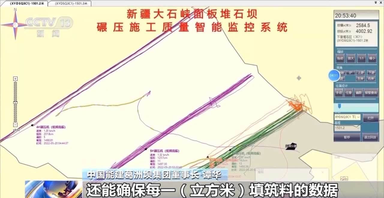 在新疆,大石峡水利枢纽工程正在加紧建设。电站最大坝高247米,是目前世界最高的混凝土面板堆石坝。项目创新应用大坝填筑施工智能精细化管理系统,可以随时掌握大坝碾压实时路径、碾压次数等各种数据。