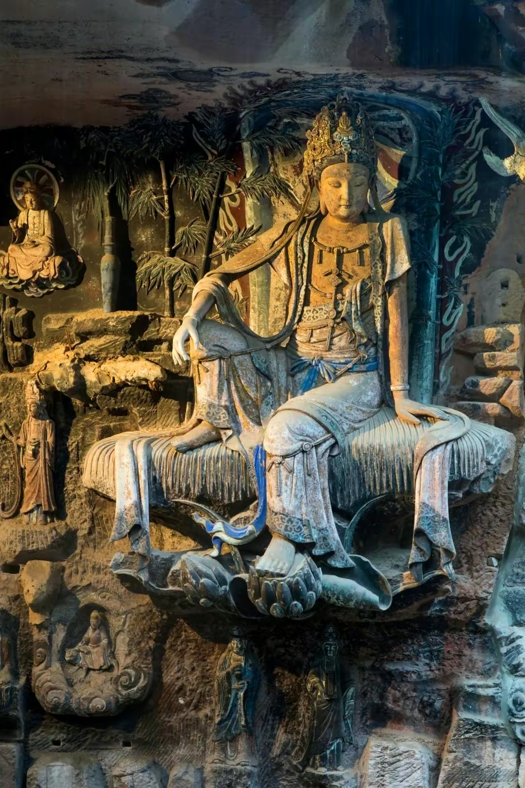 在博主的镜头里,毗卢洞的水月观音姿态潇洒,肢体柔美得像要随风起舞;虎头山茗山寺的文殊、普贤菩萨,历经近千年沧桑,依旧沉静地俯瞰着山下的芸芸众生。