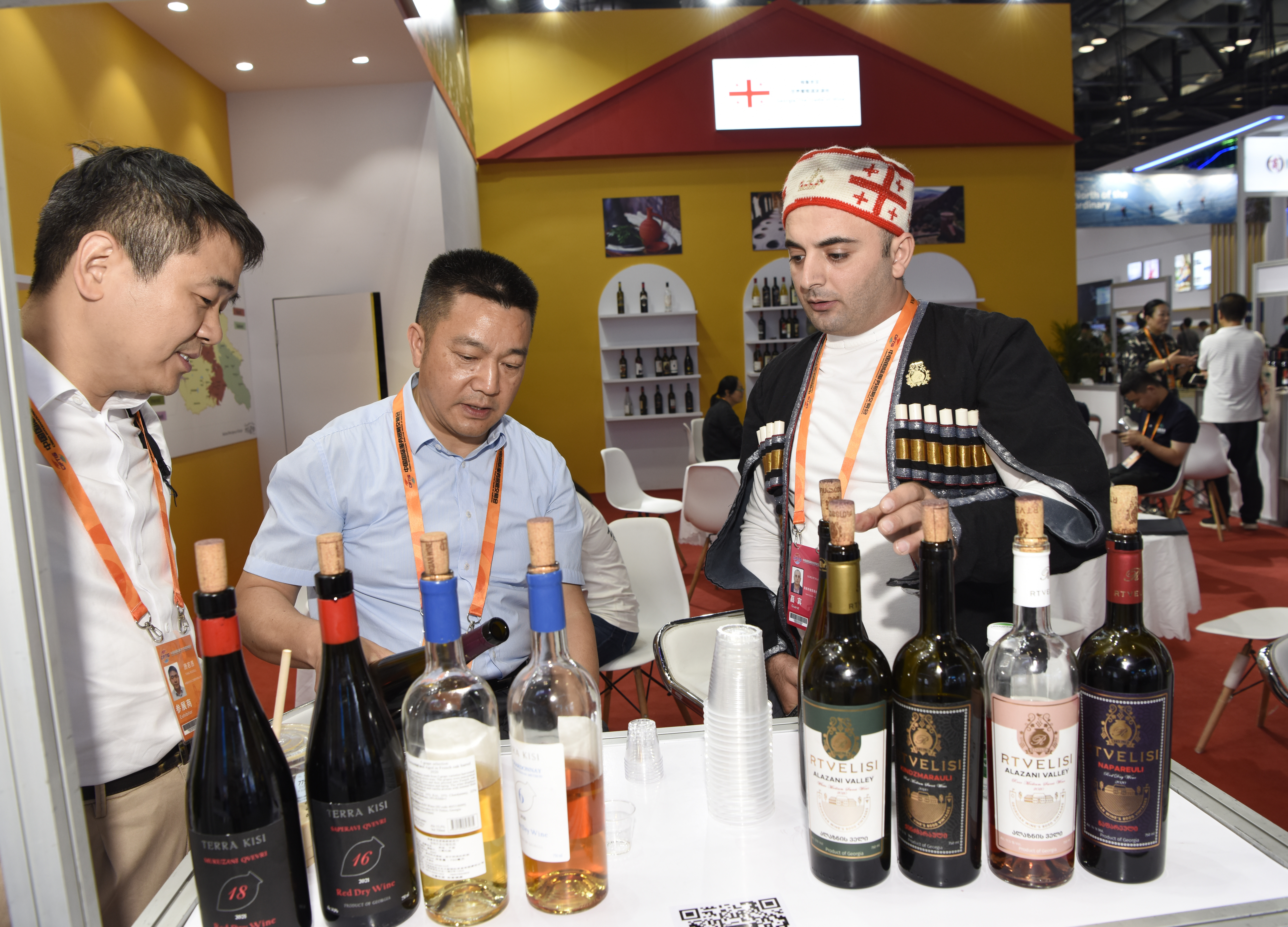 2023年9月4日,参展商在服贸会的格鲁吉亚展台品尝格鲁吉亚葡萄酒。在北京举行的2023服贸会吸引了多个国家和国际组织设展办会。(新华社记者武巍摄)
