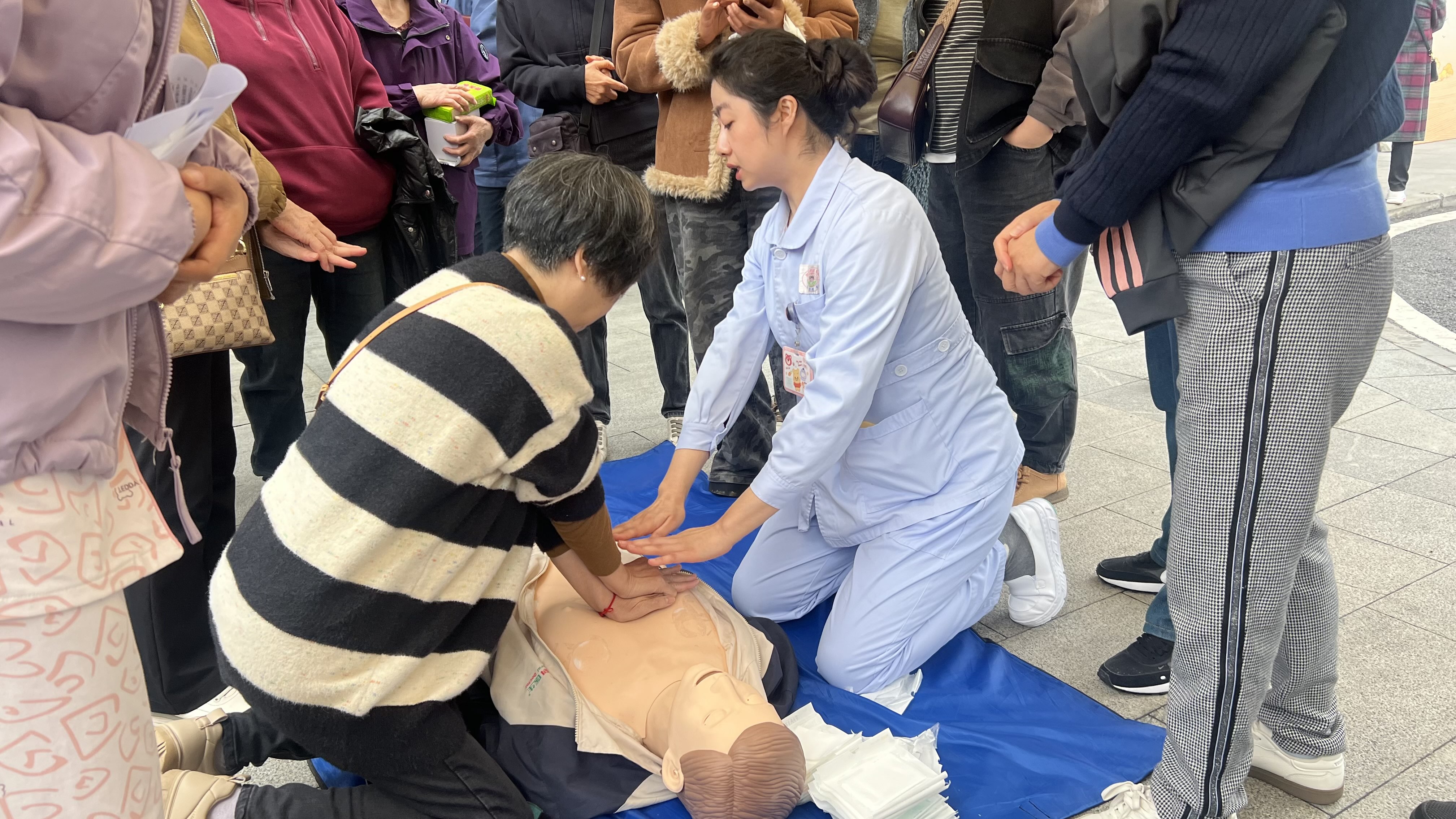 活动还特别设置了急救培训区,现场讲解并示范AED(自动体外除颤器)使用要领,演示了徒手心肺复苏全过程。这一环节不仅吸引了老年朋友认真观摩,成都地铁17号线的员工们也积极参与实操演练,旨在以专业急救技能护航乘客出行安全。