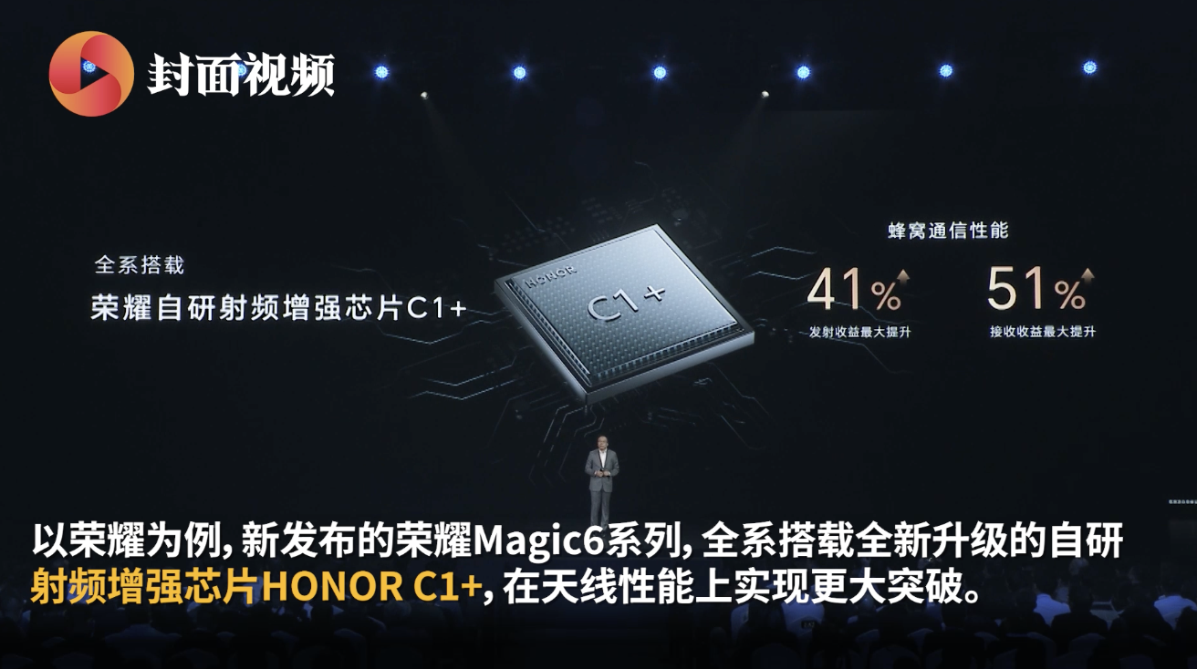 以荣耀为例,新发布的荣耀Magic6系列,全系搭载全新升级的自研射频增强芯片HONOR C1+,在天线性能上实现更大突破。荣耀Magic6 Pro还搭载了更优的手机直连卫星通信技术解决方案——荣耀鸿燕通信,是目前市面上唯二支持卫星通信功能的手机品牌和终端机型。