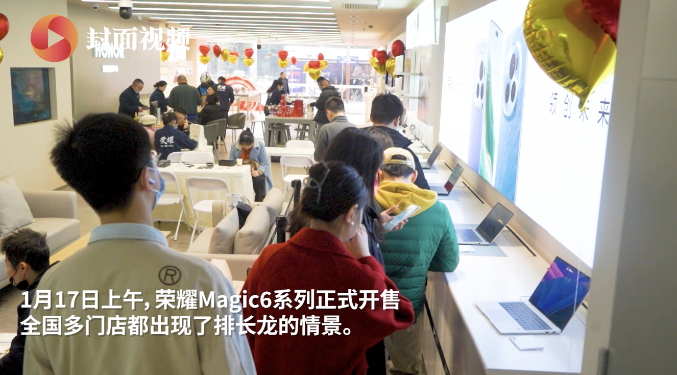 荣耀门店工作人员介绍,早上10点左右,首销正式开启,门口已经排了很多消费者。门店目前预定了100余台荣耀Magic6系列新机,取机用户已经取走70余台。她预计,伴随着线下门店“一起成龙”等一系列新年活动的开启,线下会迎来更多人流,现货新机也将更加紧俏。
