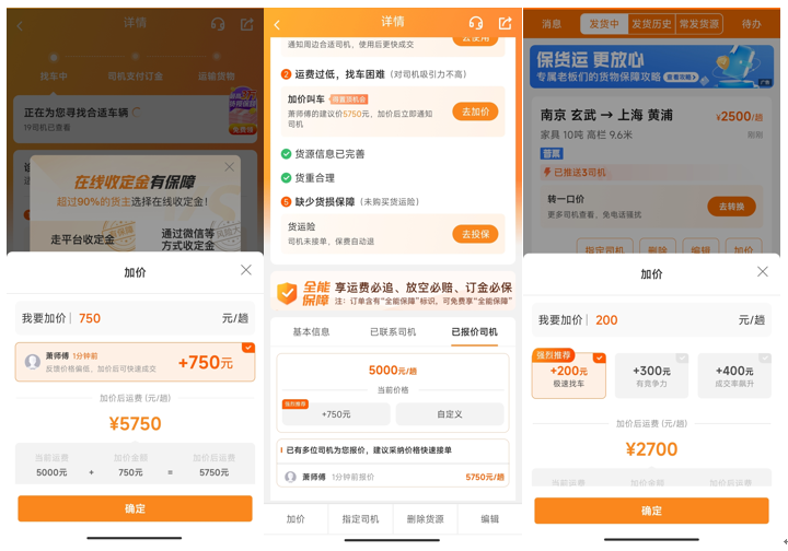 进一步地,今年下半年满帮又在司机端APP开通了司机加价反馈渠道,司机师傅可以对货源进行加价,掌握更多主动权,平台将加价信息通过多种触达方式及时传递给货主,促进司货双方更高效地沟通和成交。