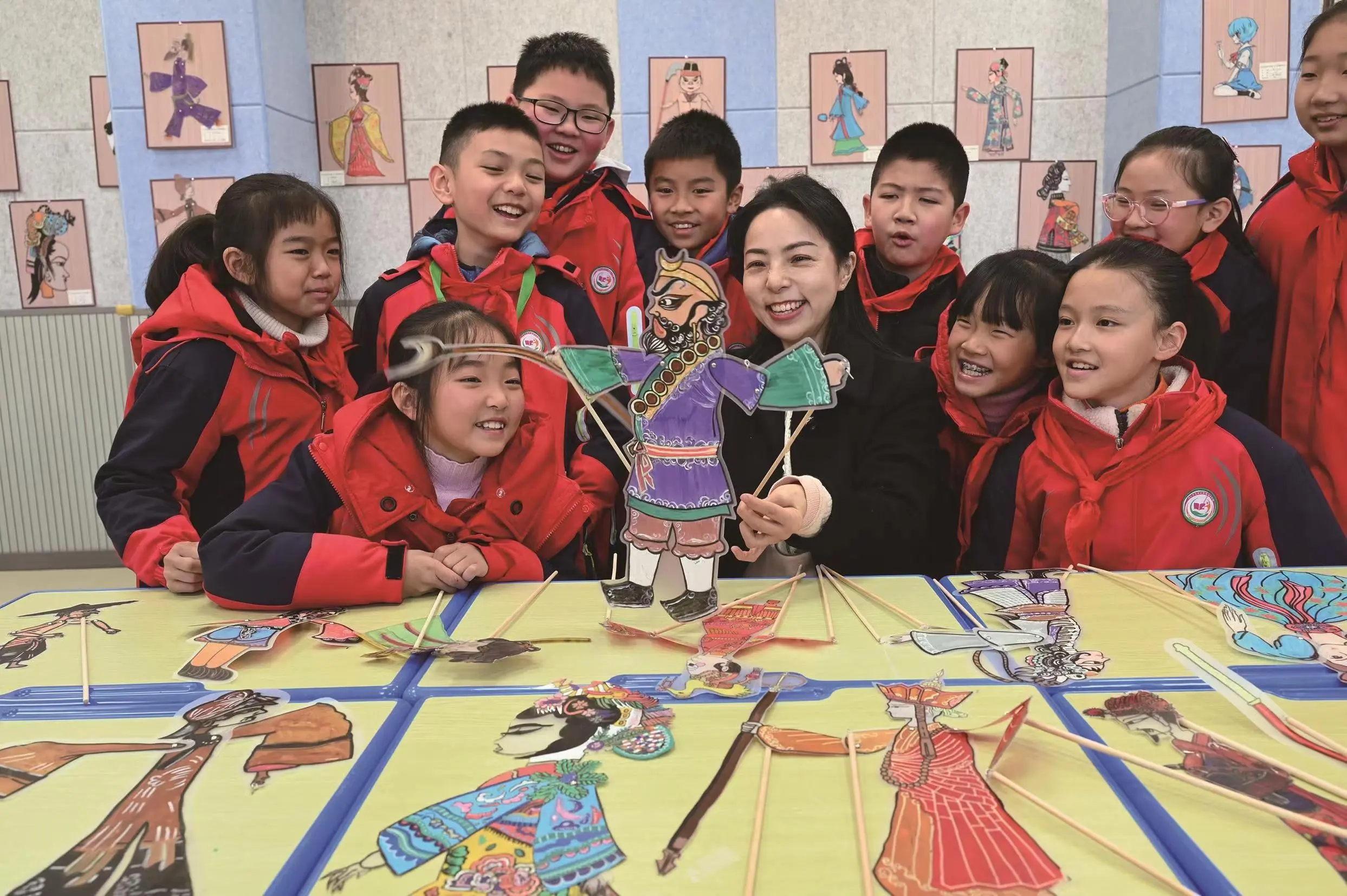 在内江市东兴区外国语小学,老师指导学生学习皮影戏表演技艺