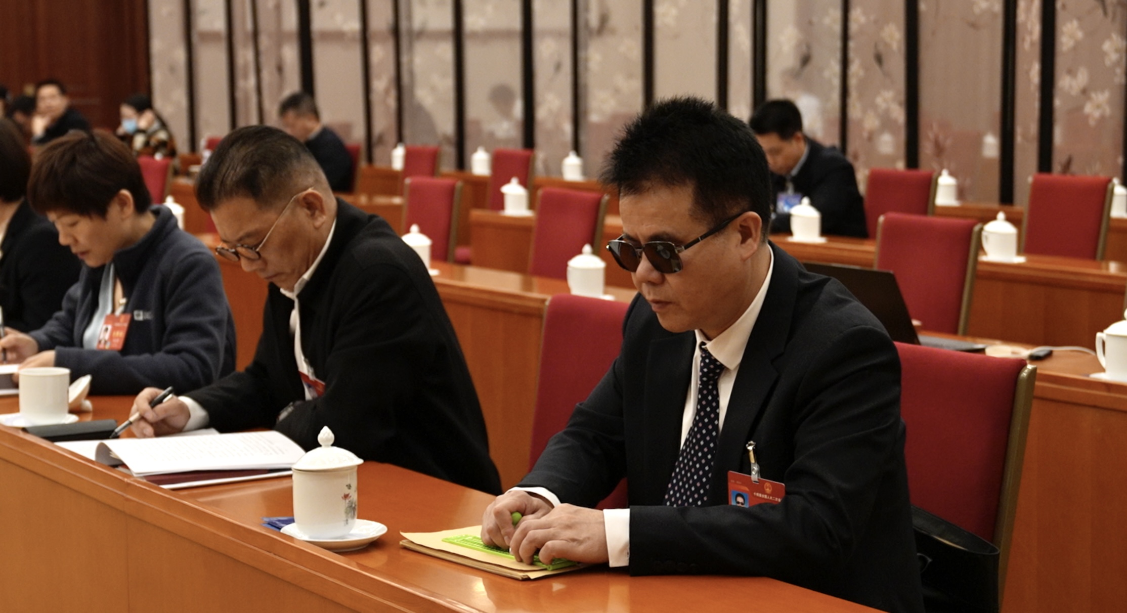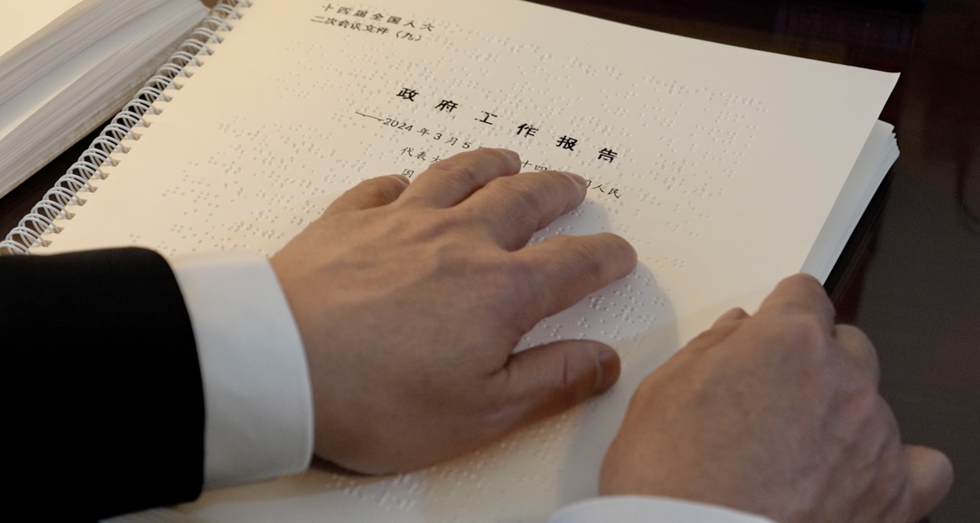 在近3000名十四届全国人大代表中,他是唯一一位视障人士。坐在人民大会堂的代表席,他耳朵听着李强总理作政府工作报告,手指轻轻摸过上面凹凸有序排列的盲文。