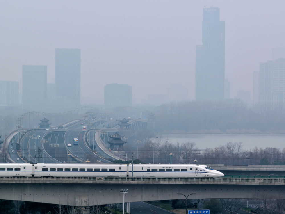 ↑ 1月25日,列车行驶在江苏省泰州市海陵区境内(无人机照片)。新华社发(汤德宏 摄)