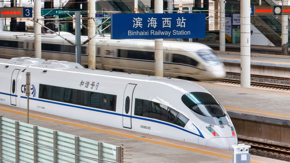 ↑ 1月25日,在天津市滨海新区,动车组列车准备驶出天津滨海西站。新华社发(杜鹏辉 摄)