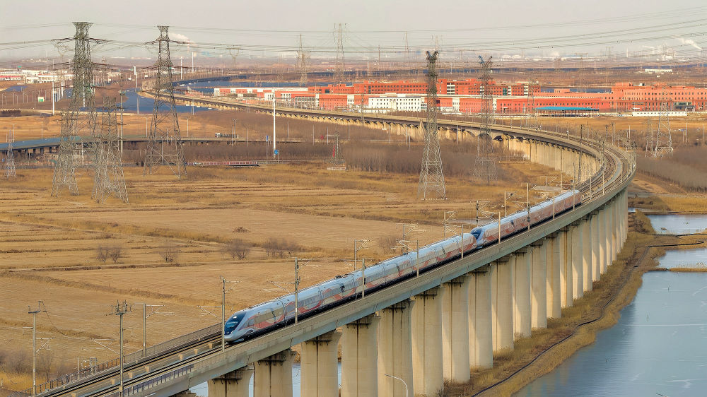 ↑ 1月25日,列车行驶在青荣城际铁路山东烟台段。新华社发(唐克 摄)