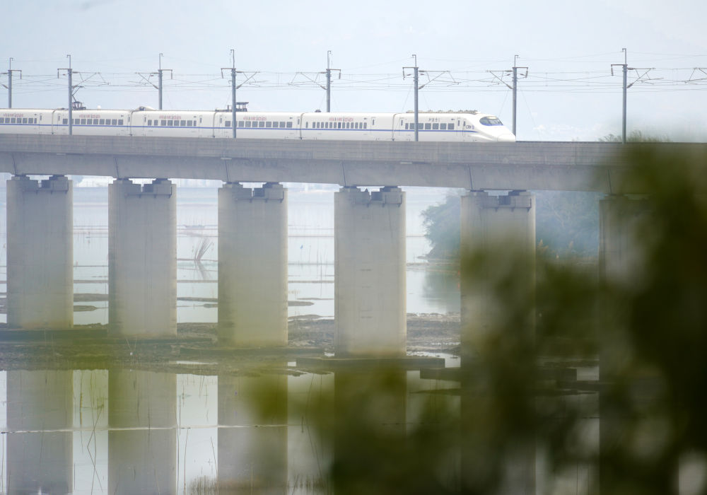 ↑ 1月25日,动车组列车在福建省厦门市境内行驶。新华社发(曾德猛 摄)