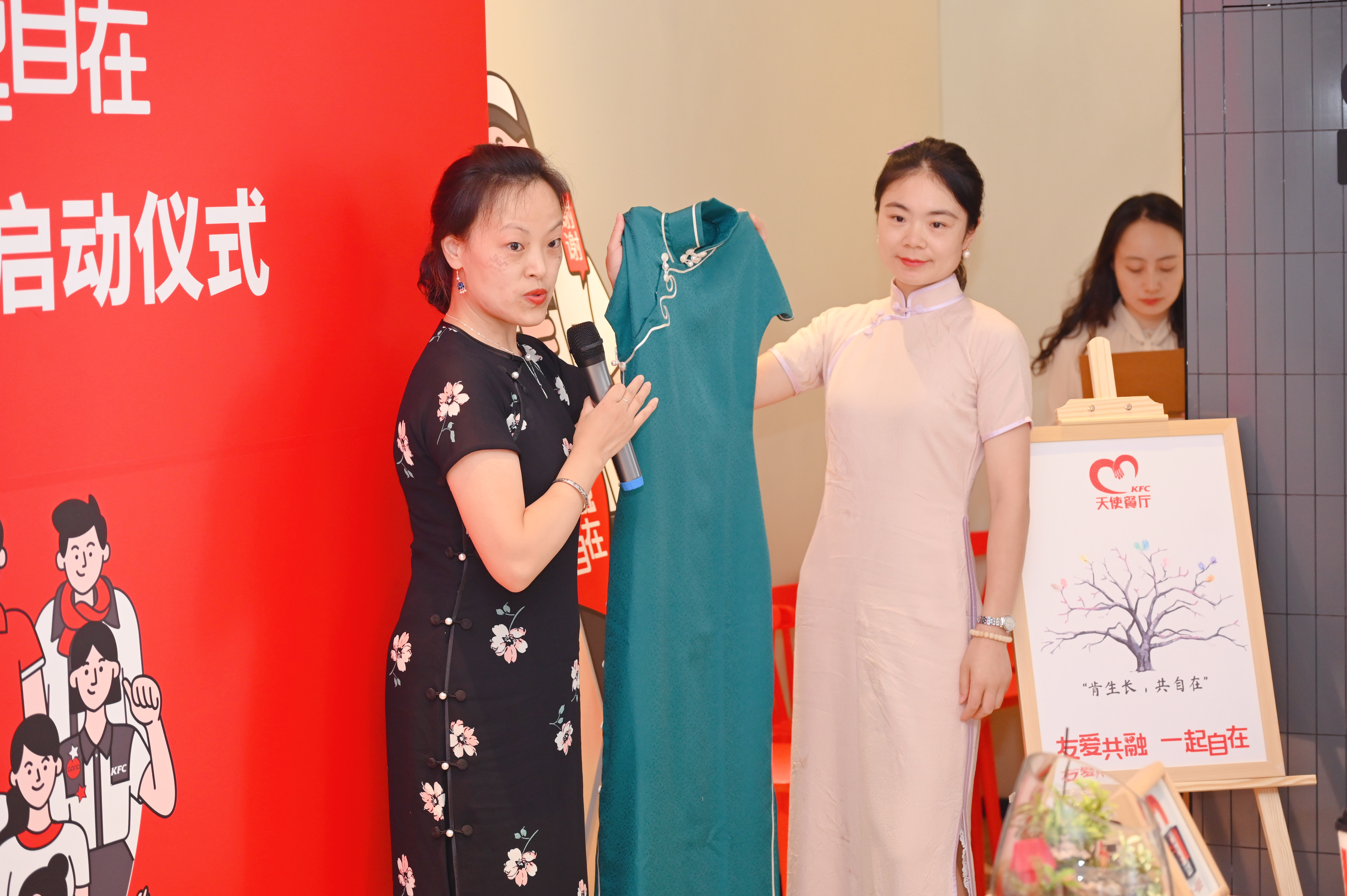 串联星光,汇聚力量。揭幕仪式现场展示了来自温江区工坊七类由残疾工匠制作的工艺品,其中以大运会“会徽”和吉祥物“蓉宝”为设计元素的两种衍纸画,为大运会特许商品。其创作者花了一天时间,为肯德基设计了以品牌形象为元素的衍纸画,以此表达对天使员工的祝福,同时,大运会火炬手秦坤在现场点亮了爱心灯,传递到天使员工手中。