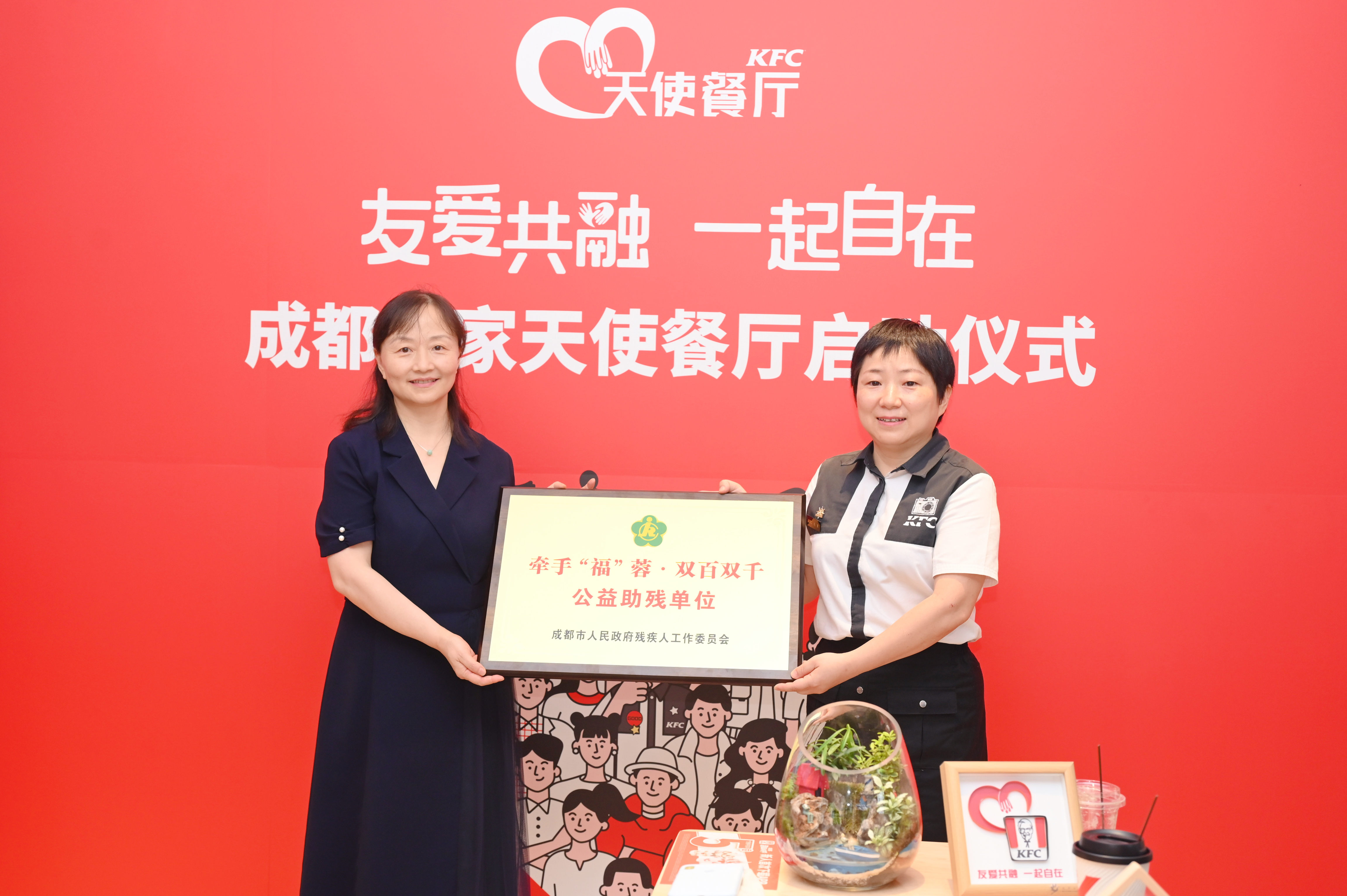 现场,成都市人民政府残疾人工作委员会向天使餐厅授予了“牵手‘福’蓉·双百双千”公益助残单位荣誉牌。“牵手‘福’蓉·双百双千”助残行动,为成都市残联联合相关部门、企事业单位和社会团体共同发起,旨在增强全社会尊残扶残助残意识,营造扶残助残社会氛围,持续提升成都城市文明水平,加快构建全龄友好包容社会。