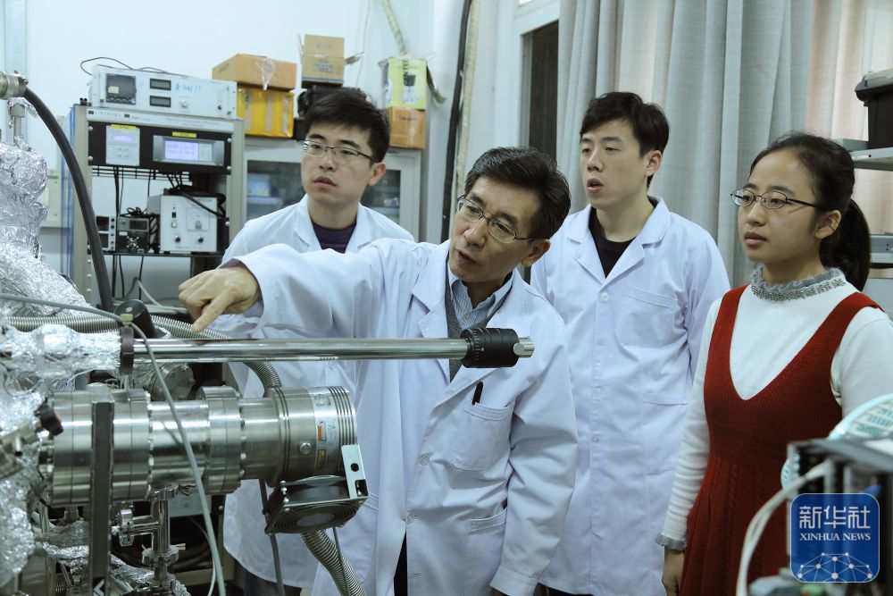 ↑2017年10月17日,薛其坤(前左)与学生在清华大学低维量子物理国家重点实验室讨论实验工作。新华社发(石加东 摄)