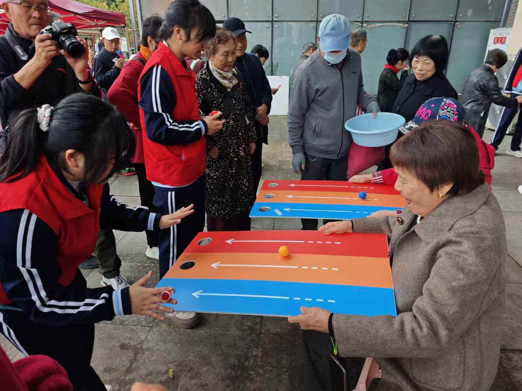 从“趣味投壶”到“超有平衡力”,再到“神笔马良”书法体验,老人们手持“游园积分卡”,兴致勃勃地穿梭于各个摊位之间。在“神笔马良”环节,多位老人凝神聚气,写下“福寿安康”“重阳安康”等祝福语,墨香四溢间传递着温暖与关怀。投壶区内,75岁的李爷爷连续投中三支箭矢,赢得满堂喝彩;平衡挑战区,张阿姨稳扎稳打,成功稳定住4个小球,展现了出色的身体控制能力。整个游园会现场充满了友好、欢乐与活力的气息,成为老年人展示风采、增进友谊的温馨舞台。