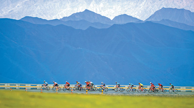 图为7月10日,参赛选手在第二十三届环青海湖国际公路自行车赛第四赛段的比赛中。 潘彬彬摄(新华社发)