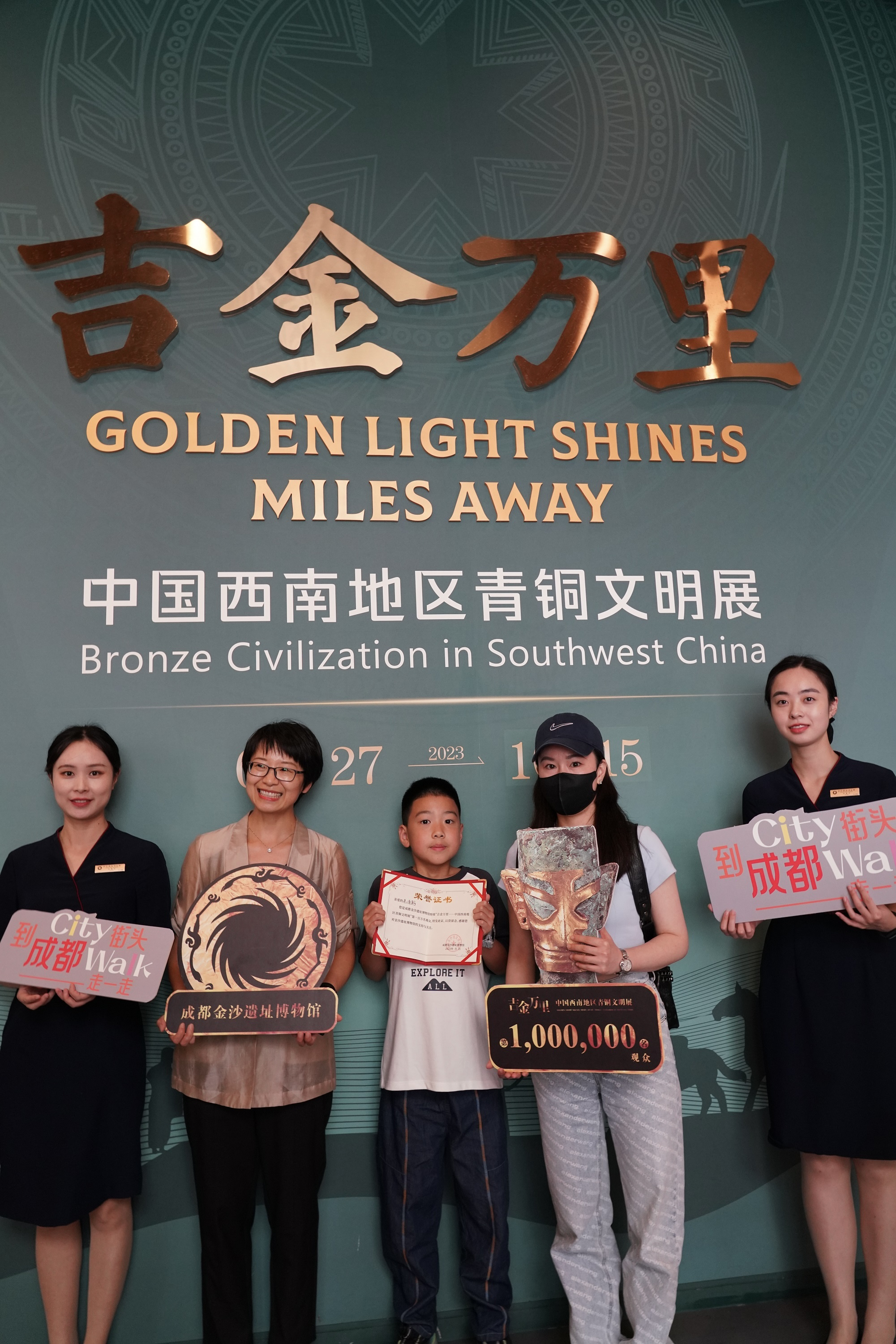精心准备的文创礼品,代表着“百万观众”的纪念证书……当李扬帆母子还未迈入博物馆的大门时,金沙遗址博物馆专职副书记郑漫丽和工作人员,已经在展厅门口静静等待,准备与现场观众共同见证特展“百万时刻”的到来。于是,当李扬帆带着儿子进入展厅的那一刻,意味着“吉金万里”特展第100万名观众诞生!