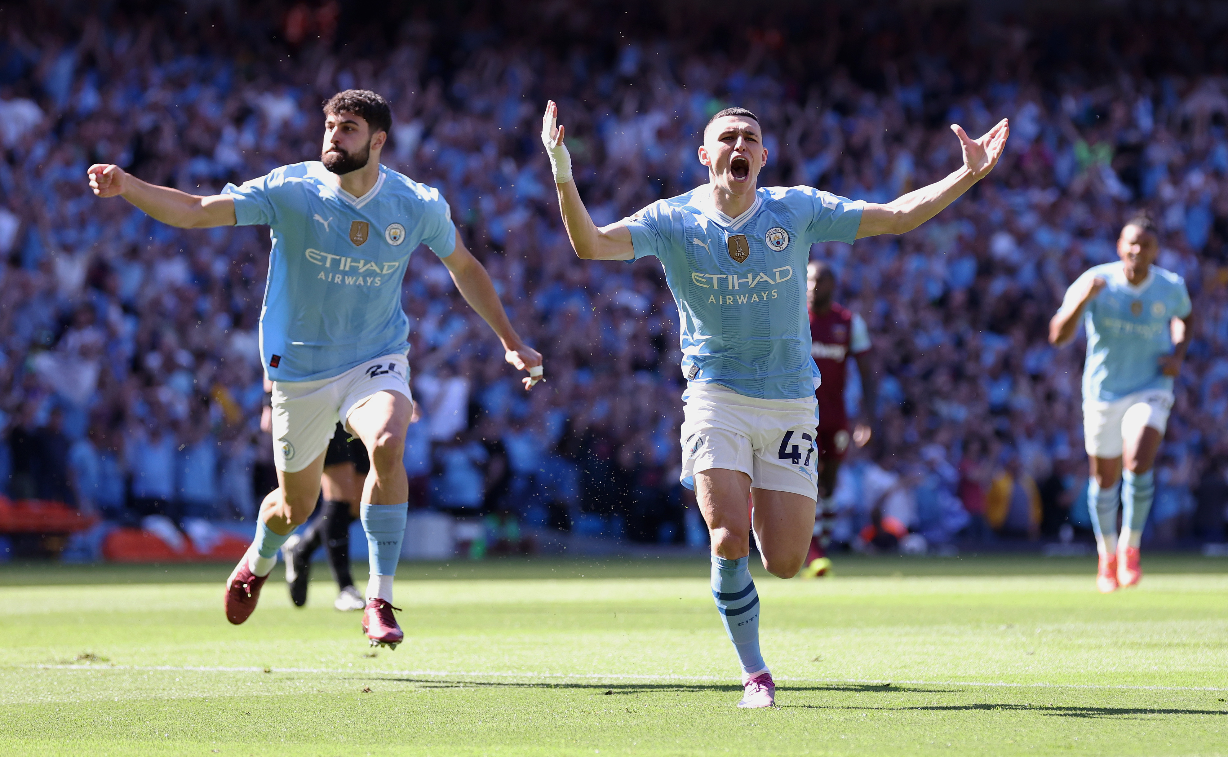 虽然西汉姆联在上半场结束前利用角球机会在曼城禁区制造混乱,由库杜斯精彩倒钩射门扳回一分,但曼城易边再战后又由罗德里推射破门,以3:1确保胜利。由此,曼城以28胜7平3负积91分的战绩连续第四个赛季称霸英超。