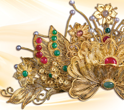 雁鸿制作的花丝蝴蝶牡丹冠。该作品采用成都银花丝制作技艺,由足银制成。