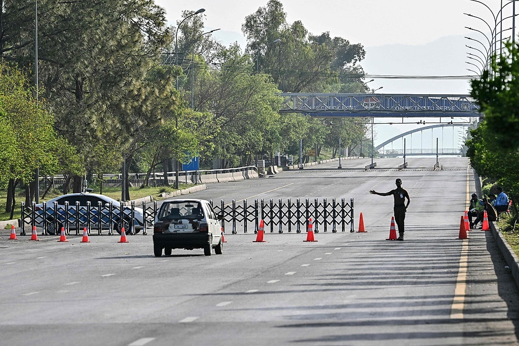 △当地时间4月25日,巴基斯坦伊斯兰堡,一名安全人员在红区封闭道路处疏导交通