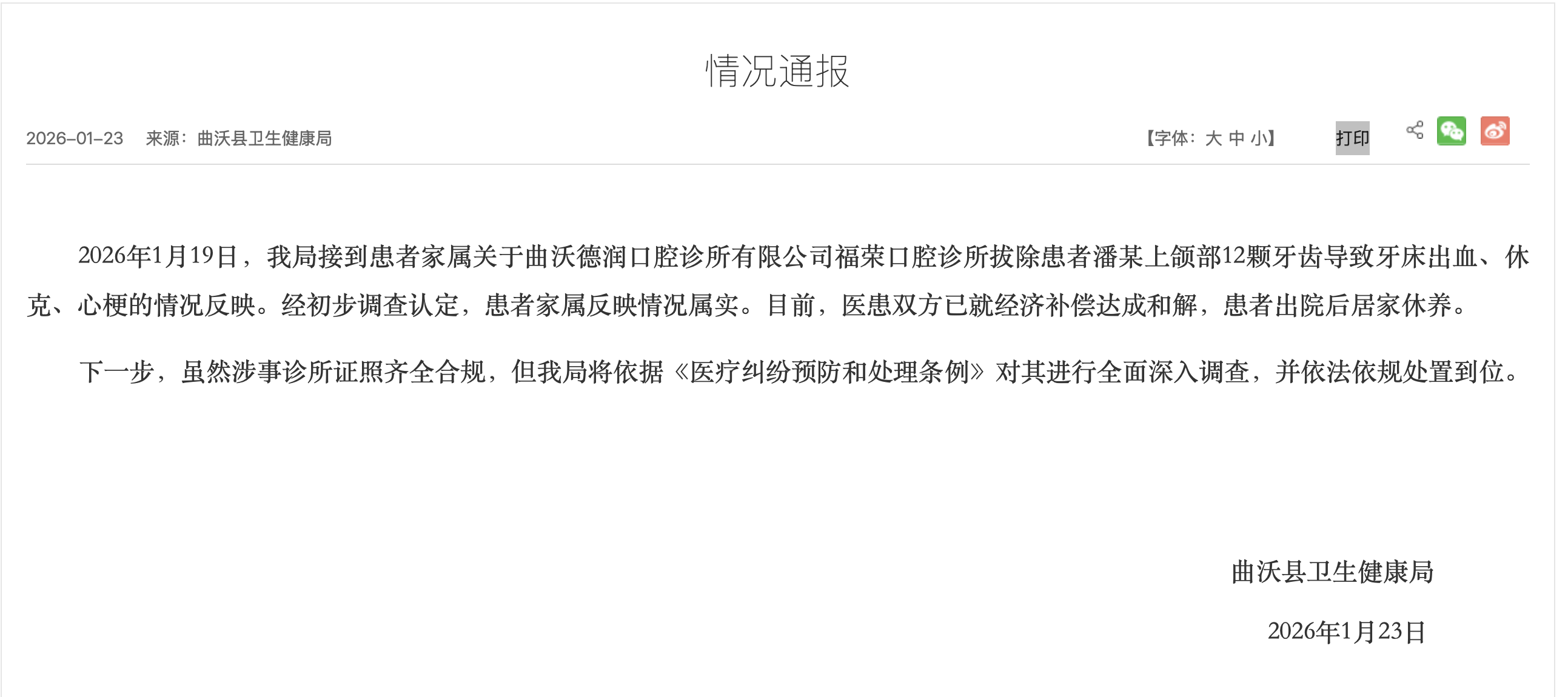 1月23日,封面新闻报道了山西曲沃县一53岁女子被一次性拔牙12颗。1月23日,曲沃县卫生健康局对此发布情况通报称,1月19日,接到患者家属关于曲沃德润口腔诊所有限公司福荣口腔诊所拔除患者潘某上颌部12颗牙齿导致牙床出血、休克、心梗的情况反映。经初步调查认定,患者家属反映情况属实。目前,医患双方已就经济补偿达成和解,患者出院后居家休养。