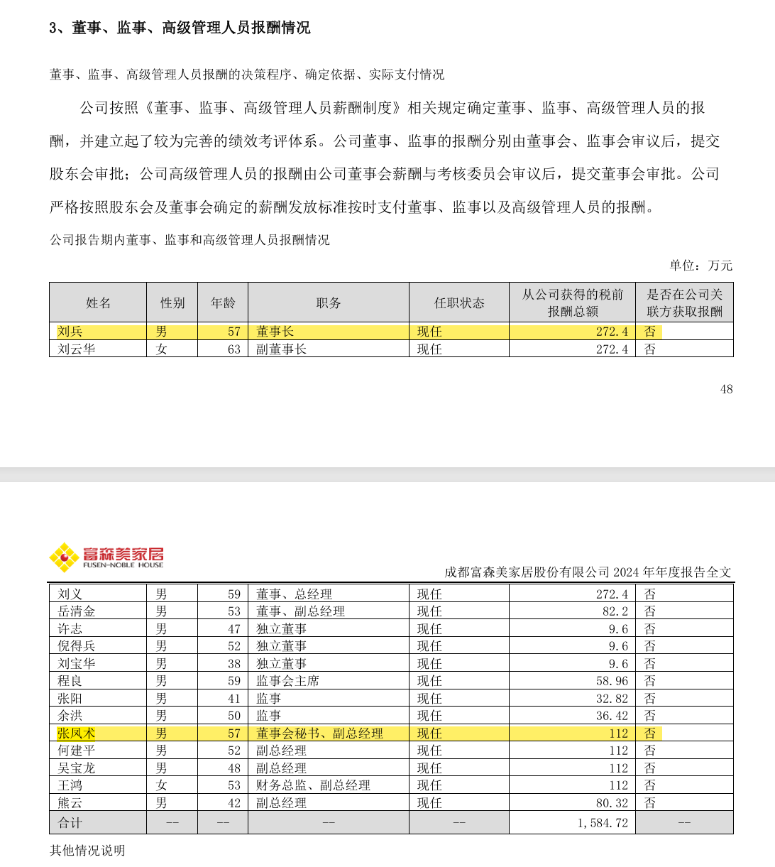 面对业绩下滑,富森美管理层主动下调薪酬。2024年年报披露,董事长刘兵、副董事长刘云华、总经理刘义三人年薪从2023年的276万元降至272.4万元,各减薪3.6万元;董事会秘书张凤术薪酬由122万元降至112万元,降幅10万元。