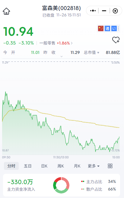 二级市场方面,截至11月26日收盘,富森美每股报价10.94元,下跌3.1%,总市值约81.88亿元。
