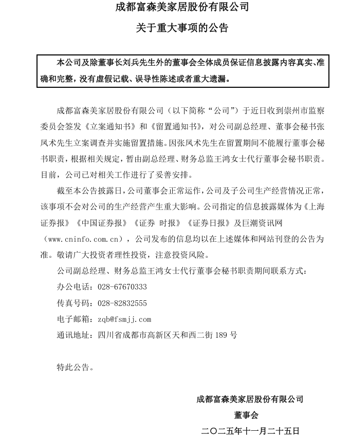 11月25日,富森美(002818.SZ,成都富森美家居股份有限公司)发布重大事项的公告。公告称,成都富森美家居股份有限公司于近日收到崇州市监察委员会签发《立案通知书》和《留置通知书》,对公司副总经理、董事会秘书张凤术立案调查并实施留置措施。