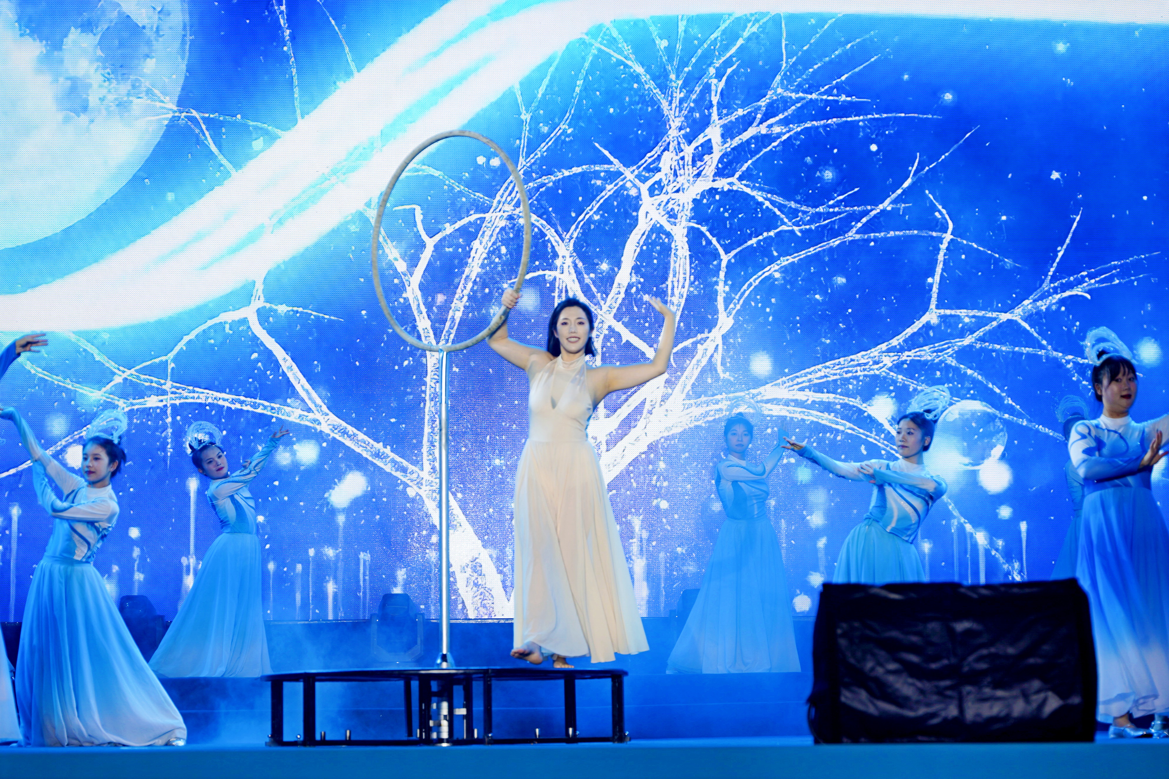 第三篇章“居者自豪”,古今对话《问月》通过现代与古代人的隔空对话,巧妙展现了科技发展与国家强大带来的时代变迁。惊险杂技《奔月》以高难度技巧展现力与美的完美结合,激昂歌舞《未来我来》则唱出了乐山人建设美好家园的自信与豪情。