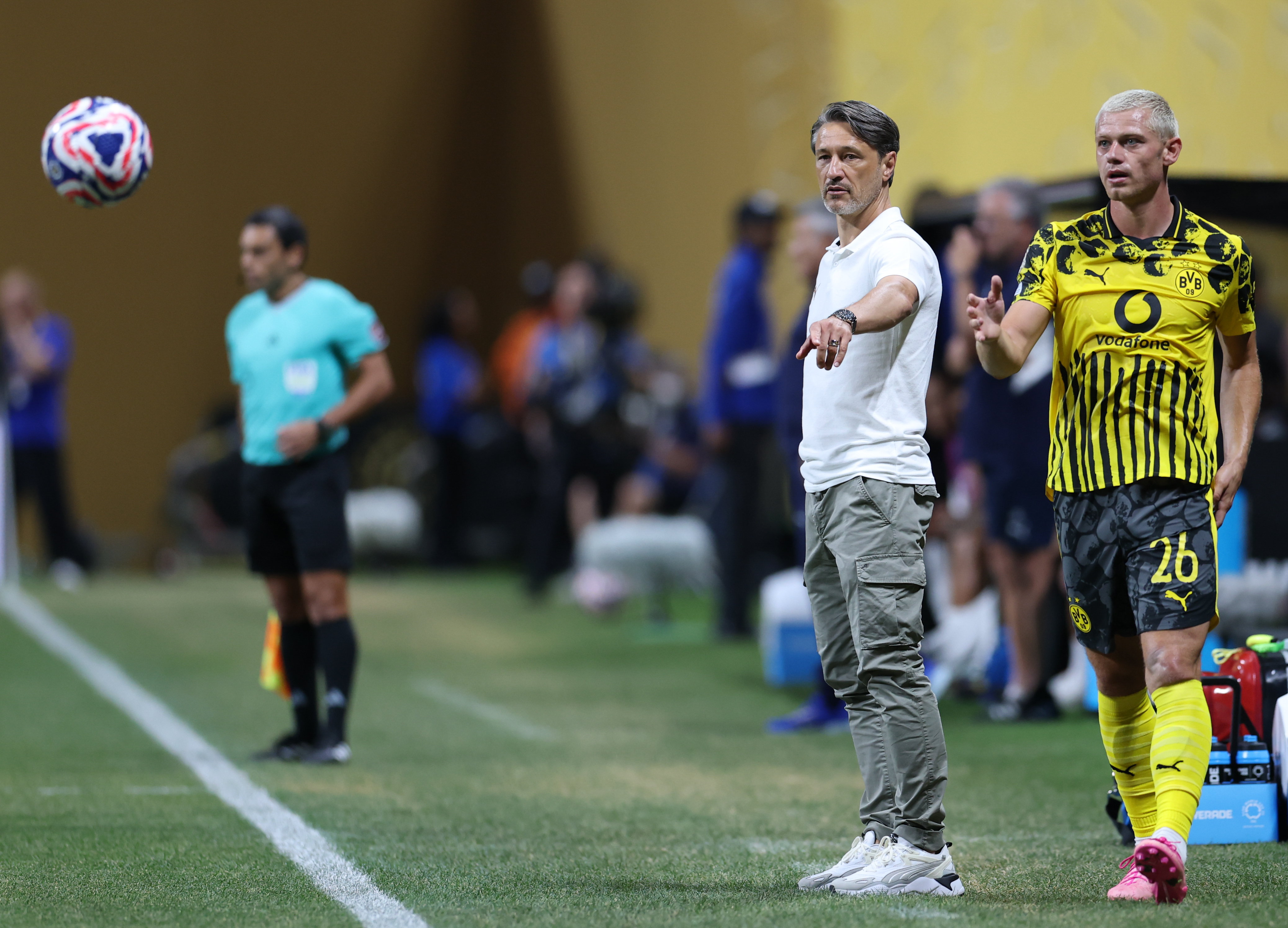 7月1日,多特蒙德队主教练科瓦奇(右二)在比赛中指导。新华社记者 李明 摄