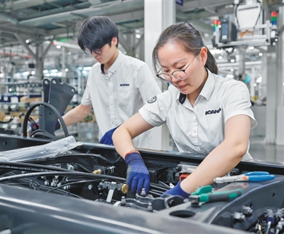 斯堪尼亚江苏如皋工业生产基地内,技术人员正在紧张作业。 斯堪尼亚供图