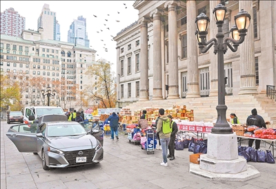美国密歇根大学近日发布的调查显示,美国消费者信心指数持续下降,高物价和收入下滑令消费者感到沮丧。图为在美国纽约拍摄的一处免费食物发放点。 新华社发