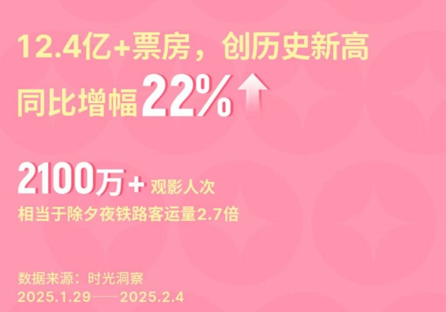 2月5日,万达电影公布数据显示,今年春节档,票房超过12.4亿元,同比增长22%;超2100万人次的观众购票观影,是今年除夕铁路客运量的2.7倍。值得注意的是,“新年的第一场电影”成为蛇年新春的仪式感,引得Z世代争相打卡,2025年大年初一,有超3000场次的放映,上座率超过了70%。