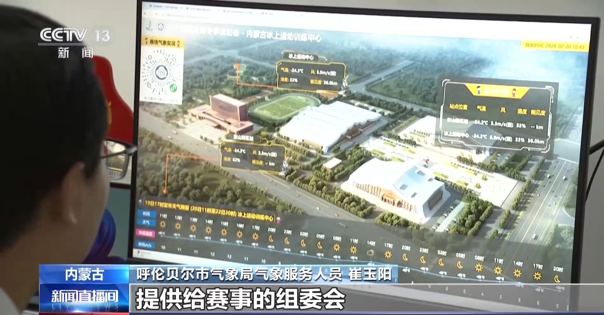 呼伦贝尔市气象局气象服务人员 崔玉阳:海拉尔赛区的气象保障部门,采用了精细化预报的方式为赛事提供服务。0到24小时是逐小时预报,24到72小时是逐3小时预报,72到240小时是逐12小时预报。我们会把这些预报提供给赛事的组委会、赛事后勤保障部门以及运动员和教练员们,让他们在赛事期间能够得到后方保障。