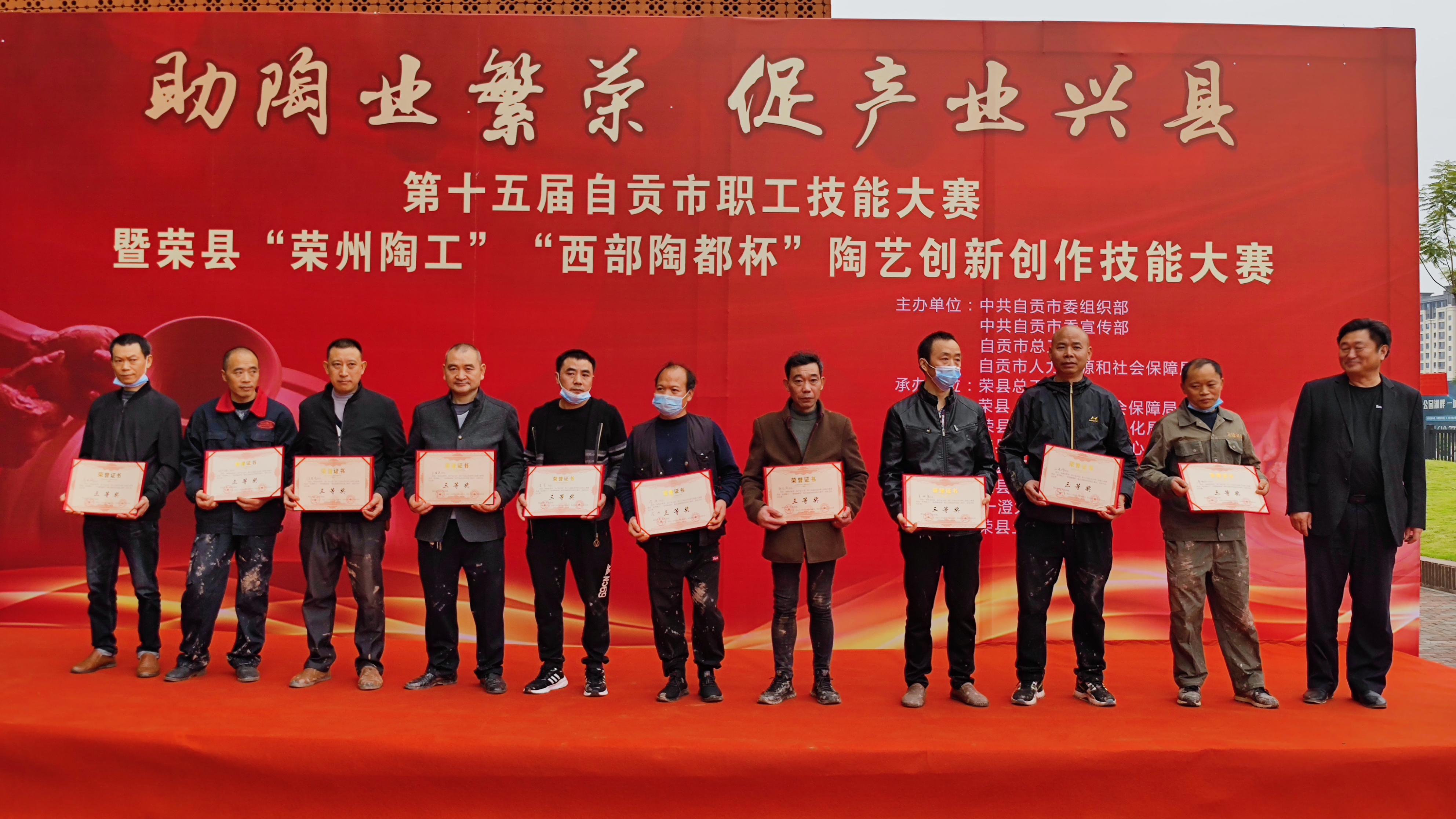 经过现场评委的打分,手拉坯比赛共评出特等奖1名、一等奖2名、二等奖5名、三等奖10名,工艺制作比赛共评出特等奖1名,一等奖2名,二等奖3名,三等奖5名,并分别进行了表彰奖励。