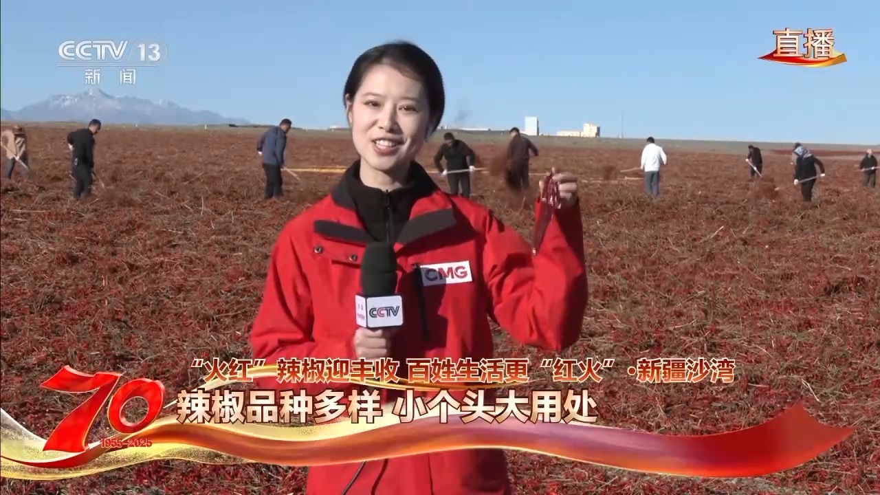 总台央视记者 张丛婧:我现在就在新疆沙湾市安集海镇的万亩戈壁晾晒场上,村民们正在晾晒刚采收的辣椒,阳光一照,浓郁的辣香扑鼻而来。