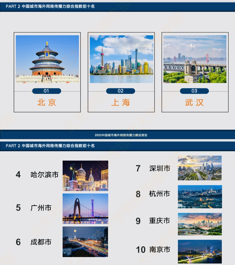 会上,北师大新闻传播学院院长、北师大新媒体传播研究中心主任张洪忠发布了《2022中国城市海外网络传播力建设报告》。《报告》显示,纳入此次调查的337座城市,海外网络传播力综合指数前十名依次为:北京、上海、武汉、哈尔滨、广州、成都、深圳、杭州、重庆、南京。