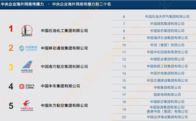 北师大新闻传播学院副院长、北师大新闻传播学院国际传播策略与效果评估研究中心主任周敏发布了《2022中央企业海外网络传播力建设报告》。2022年海外传播力综合指数排名前十的央企为:中国石油化工集团有限公司、中国移动通信集团有限公司、中国南方航空集团有限公司、中国中车集团有限公司、中国东方航空集团有限公司、中国石油天然气集团有限公司、中国建筑集团有限公司、中国医药集团有限公司、中国海洋石油集团有限公司、华润(集团)有限公司。