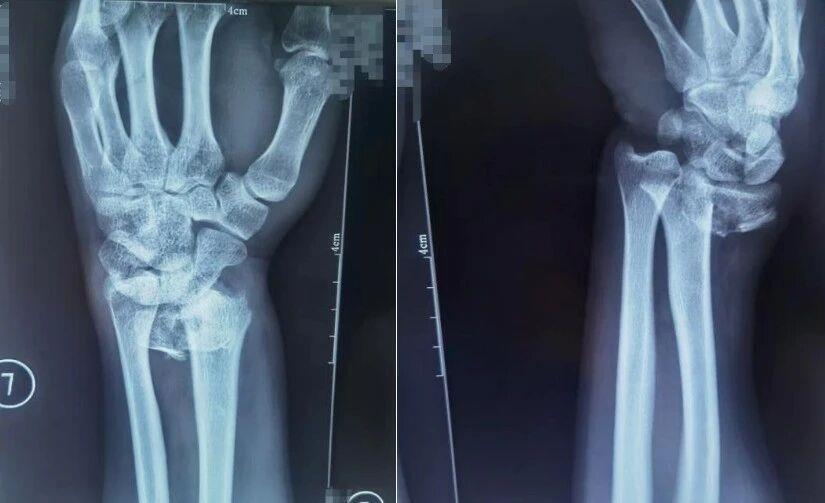 △患者桡骨远端骨折,图为复位前正位、复位前侧位。图源:哈尔滨骨伤科医院